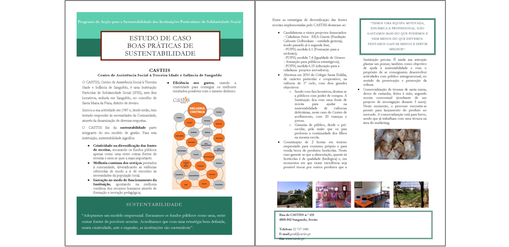 No caso do CASTIIS (pode descarregar o ficheiro aqui) o plano de acção elaborado consistiu na implementação de duas medidas principais: a elaboração de um Estudo de Caso da Instituição com as boas práticas de sustentabilidade e a implementação de um projecto de encomendas em escala/central de compras entre IPSS que se encontram na mesma área geográfica do CASTISS. O Estudo de Caso foi finalizado e é apresentado seguidamente. A outra fase do plano de acção encontra-se em desenvolvimento.